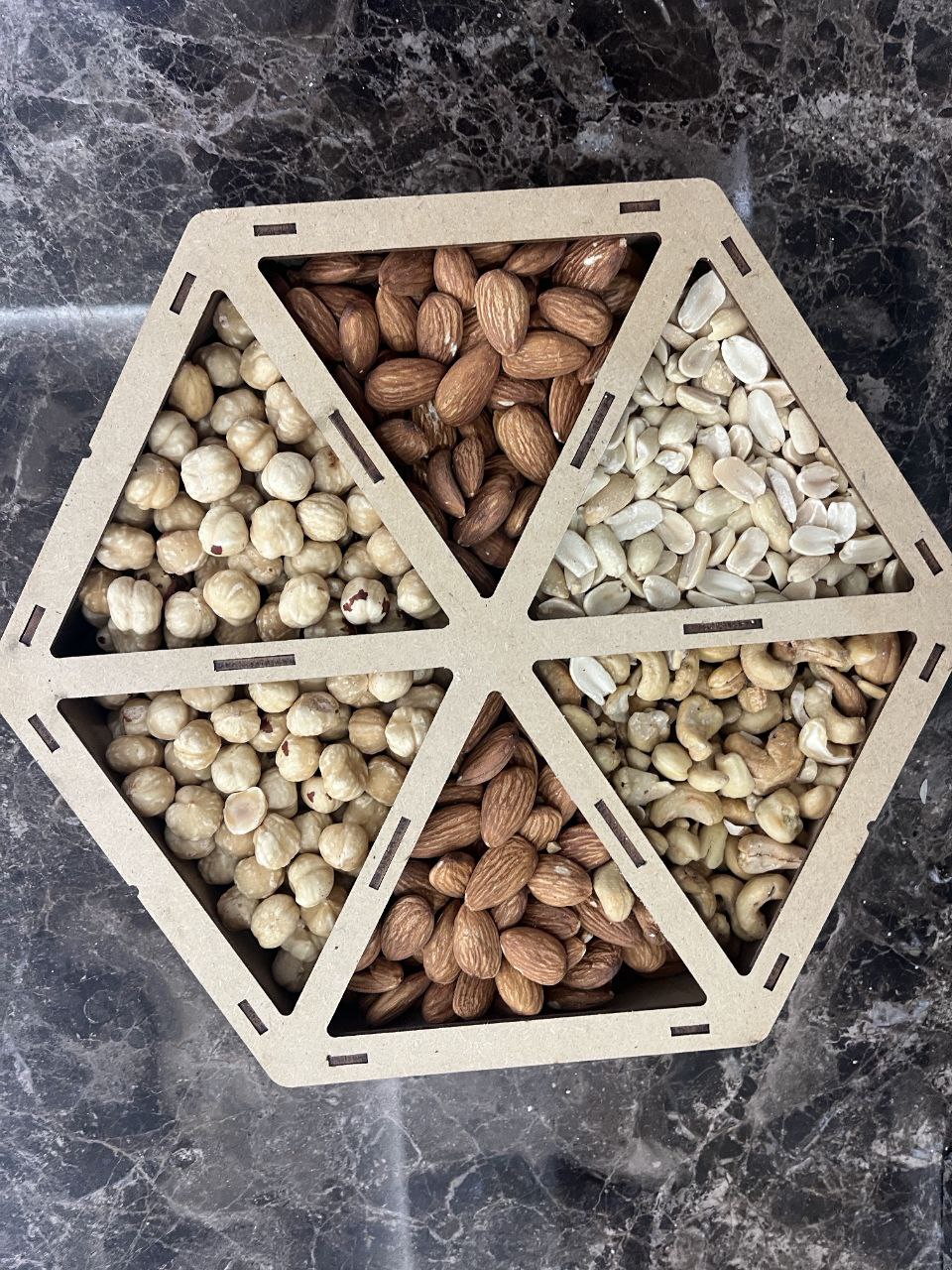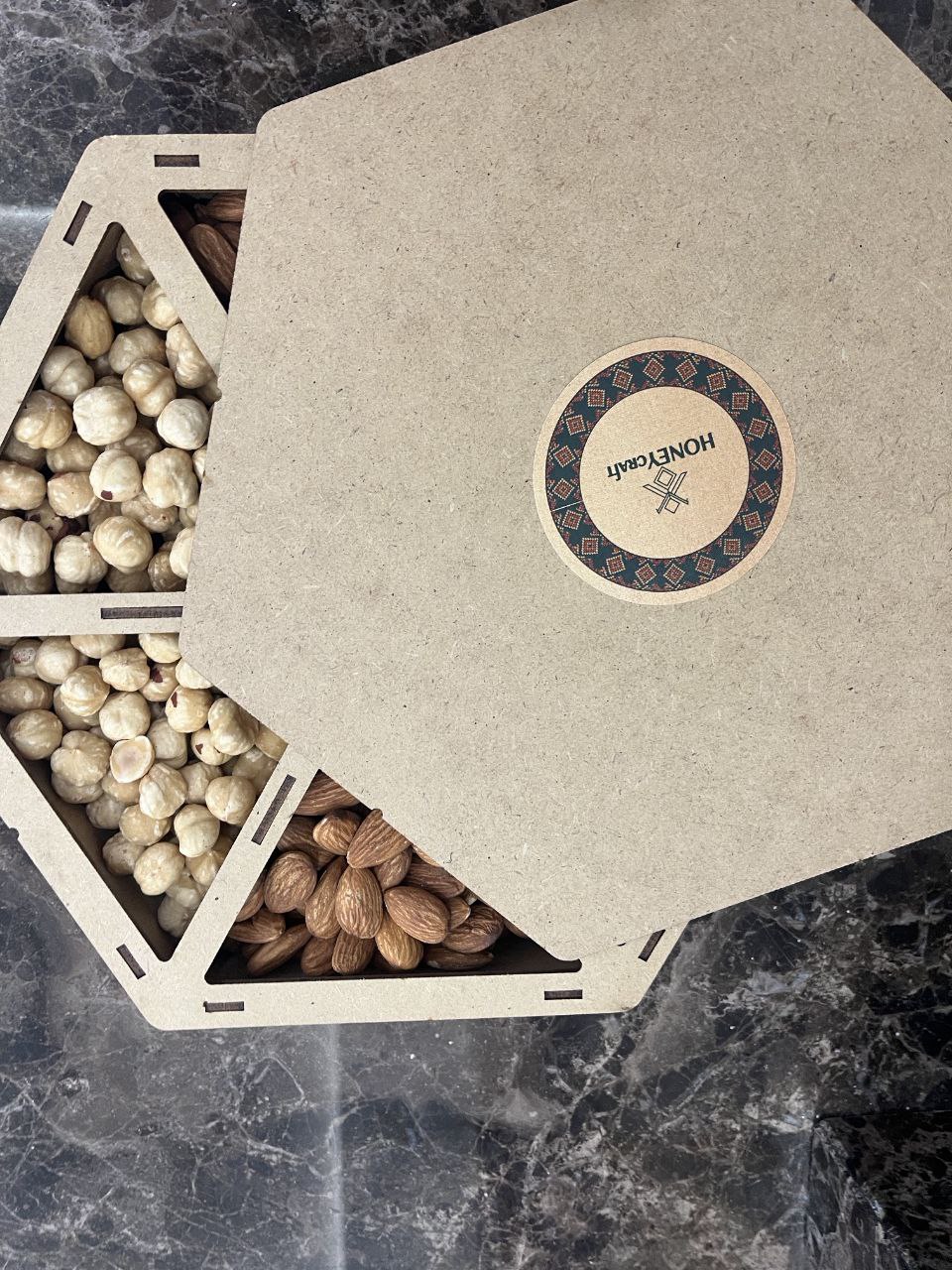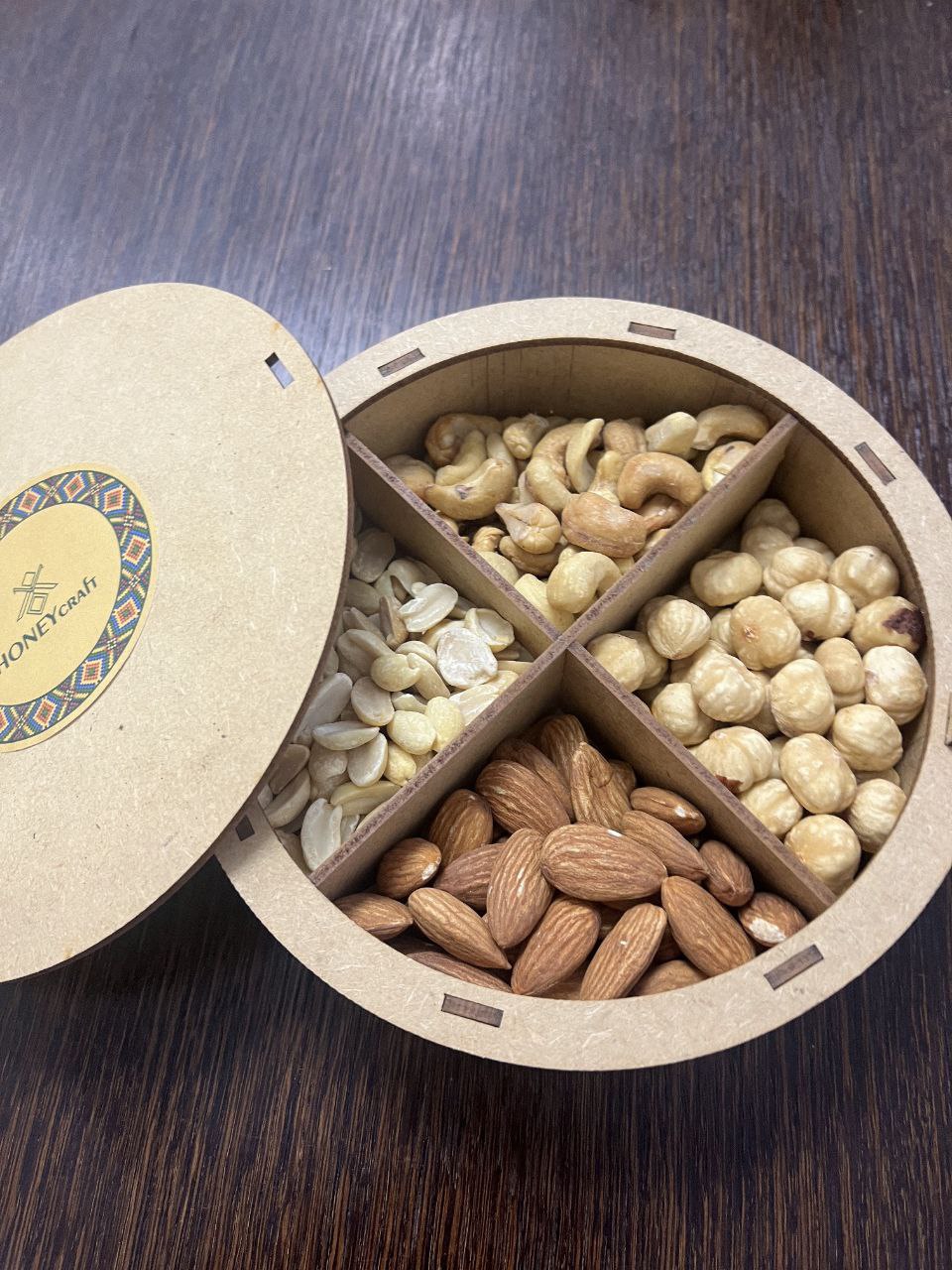 Усередині — мигдаль, фундук, кеш’ю та арахіс, розділені зручними секціями.