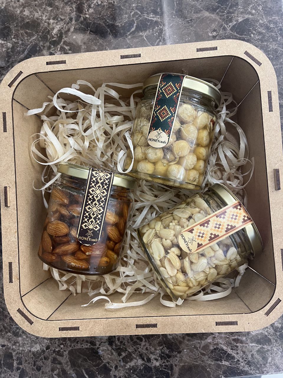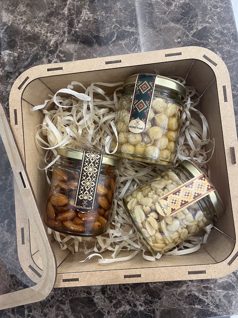 Дерев’яний подарунковий набір HoneyCraft із 3 банок карпатського меду або горіхів у меді
