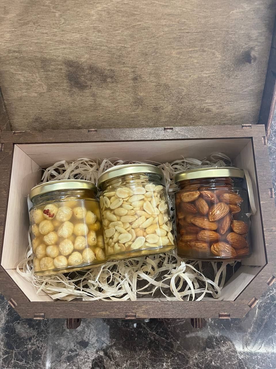 Усередині — три скляні банки об’ємом 250 мл, наповнені карпатським медом або горіхами в меді (фундук, кеш’ю, арахіс, мигдаль).
