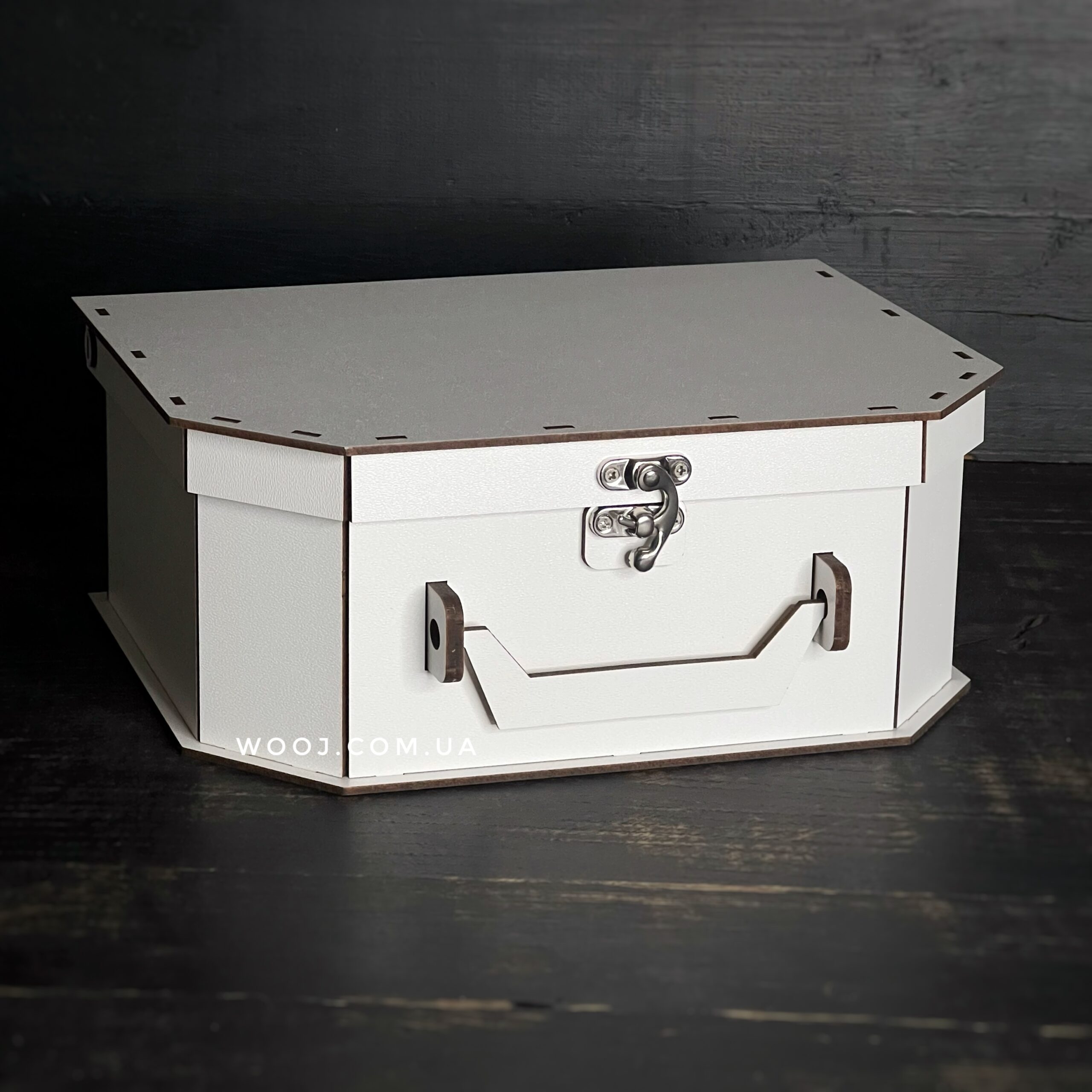 Коробка має міцну металеву застібку, ручку для зручного перенесення і доступна у двох кольорах —