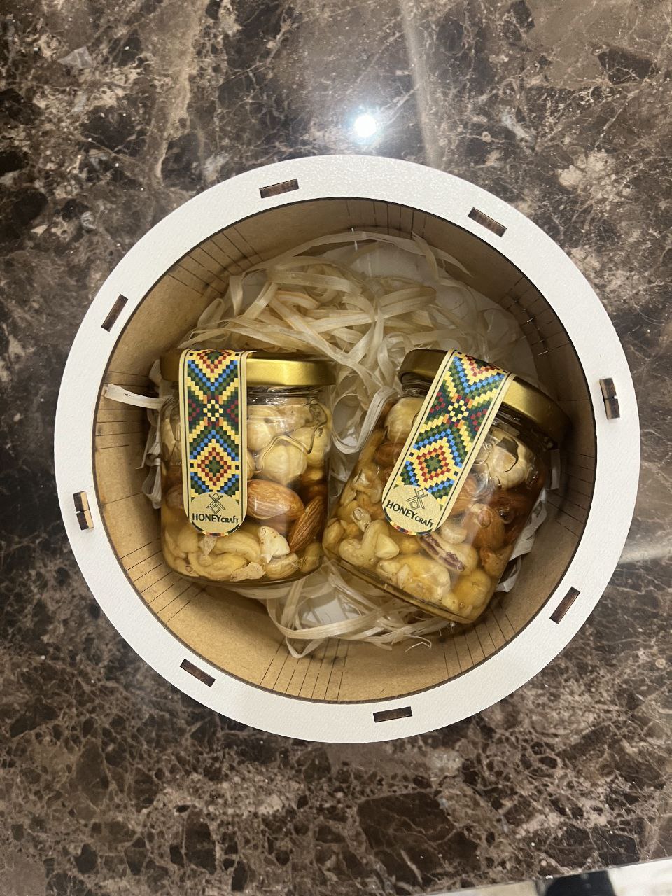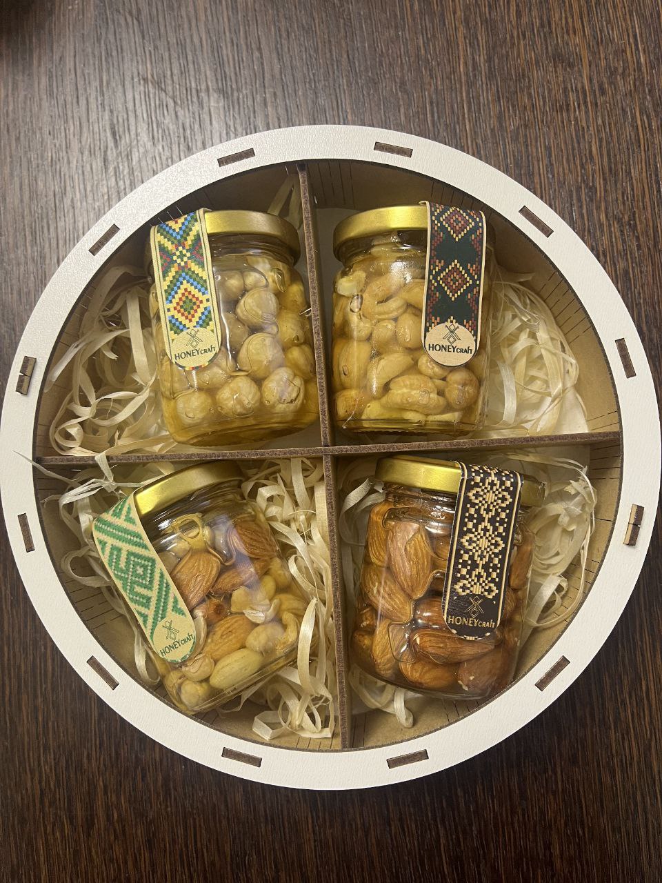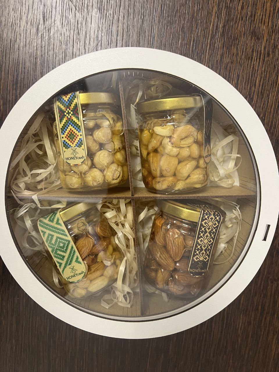 У наборі — 2 або 4 скляні баночки по 100 мл, наповнені натуральним карпатським медом або горіхами у меді.