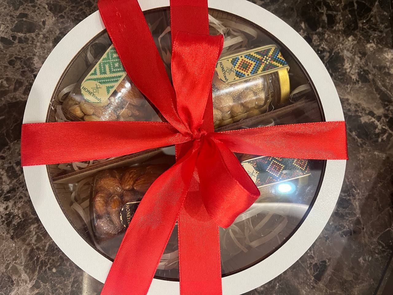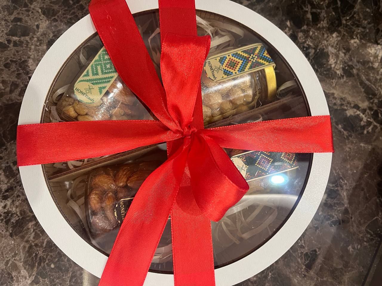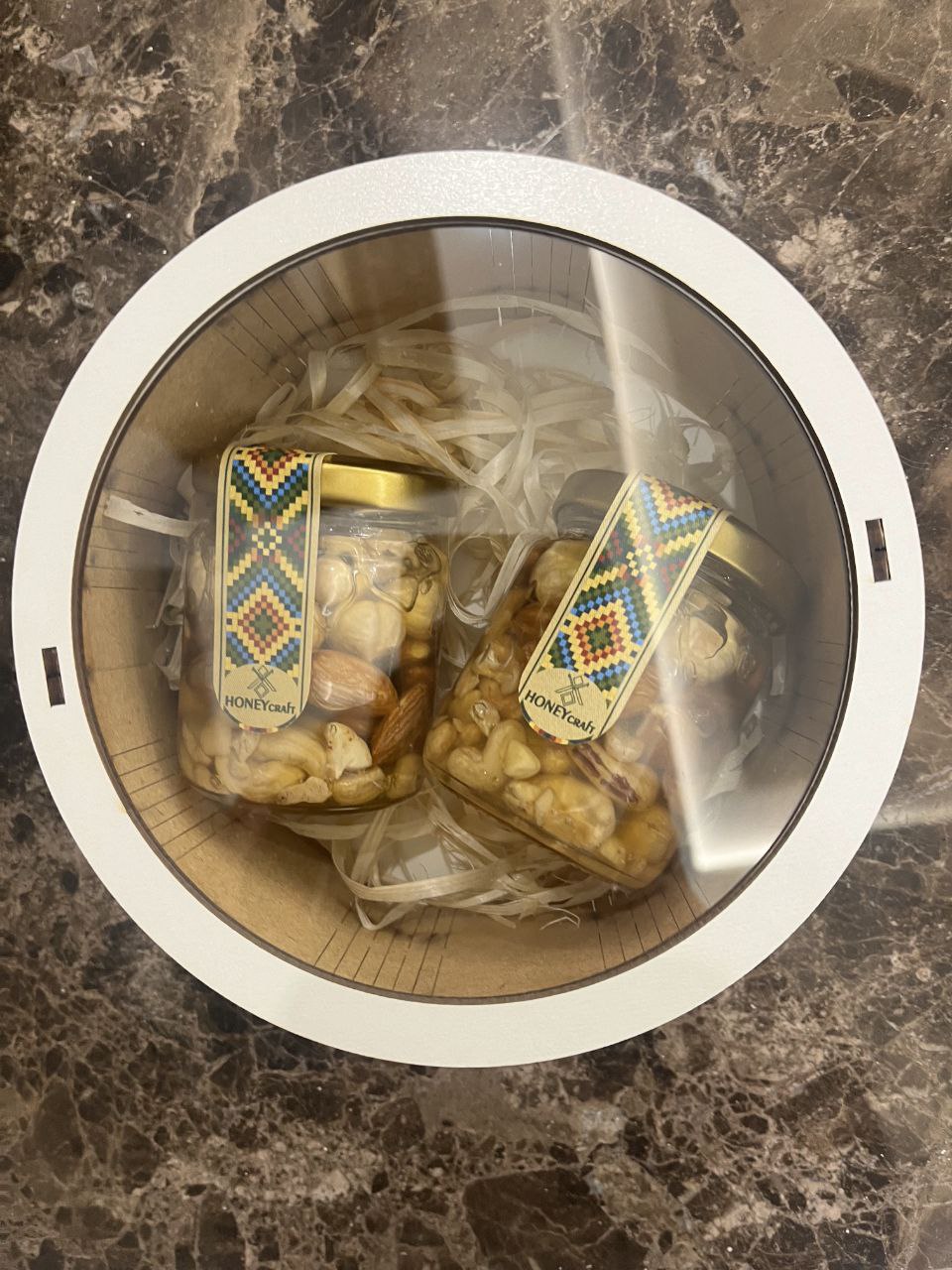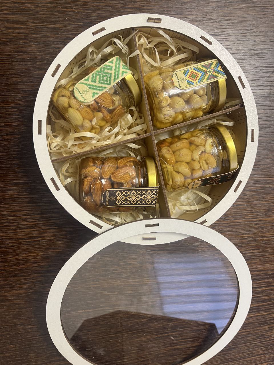 У наборі — 2 або 4 скляні баночки по 100 мл, наповнені натуральним карпатським медом або горіхами у меді.